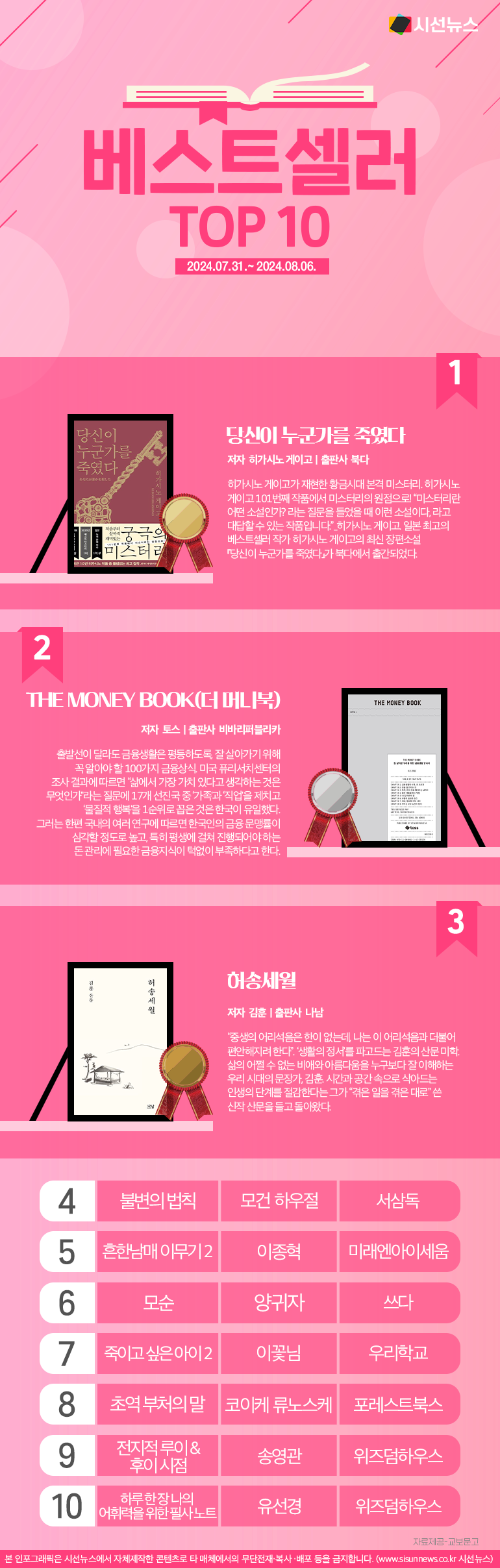시선뉴스=김선희 proㅣ이번 주에는 어떤 책들이 독자들의 사랑을 받았을까요? 교보문고에서 2024년 07월 31일부터 08월 06일까지 영업점과 인터넷에서 도서와 eBook을 합산해 1주일 간 가장 많이 판매된 책 순위를 발표했습니다.