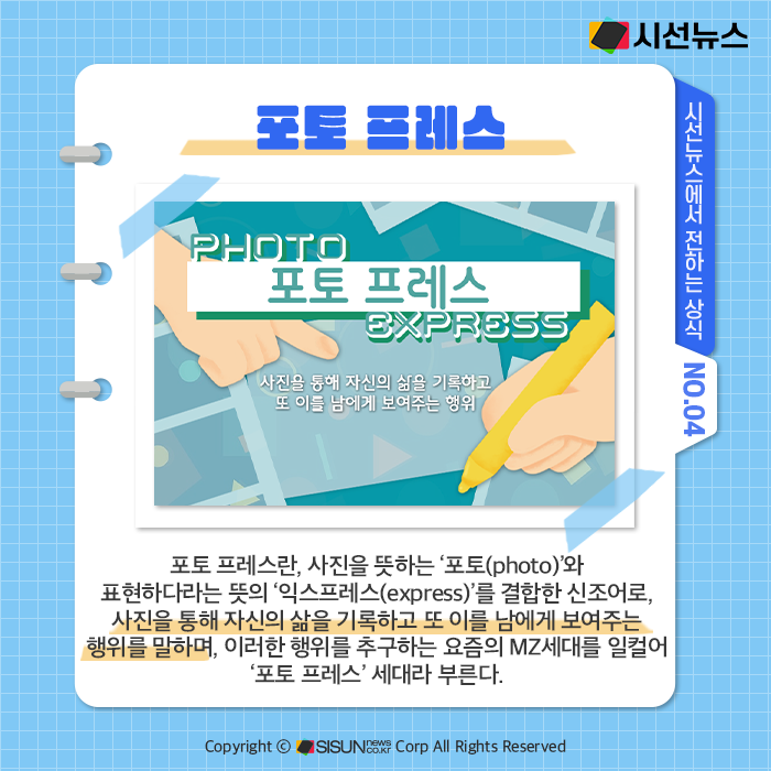 포토 프레스란, 사진을 뜻하는 ‘포토(photo)’와 표현하다라는 뜻의 ‘익스프레스(express)’를 결합한 신조어로, 사진을 통해 자신의 삶을 기록하고 또 이를 남에게 보여주는 행위를 말하며, 이러한 행위를 추구하는 요즘의 MZ세대를 일컬어 ‘포토 프레스’ 세대라 부른다. 포토 프레스 세대의 큰 특징 중 하나. 휴대전화와 카메라 그리고 컴퓨터가 하나로 융합된 ‘스마트폰’ 시대에 태어나 ‘촬영’과 ‘공유’에 익숙하다는 점이다.