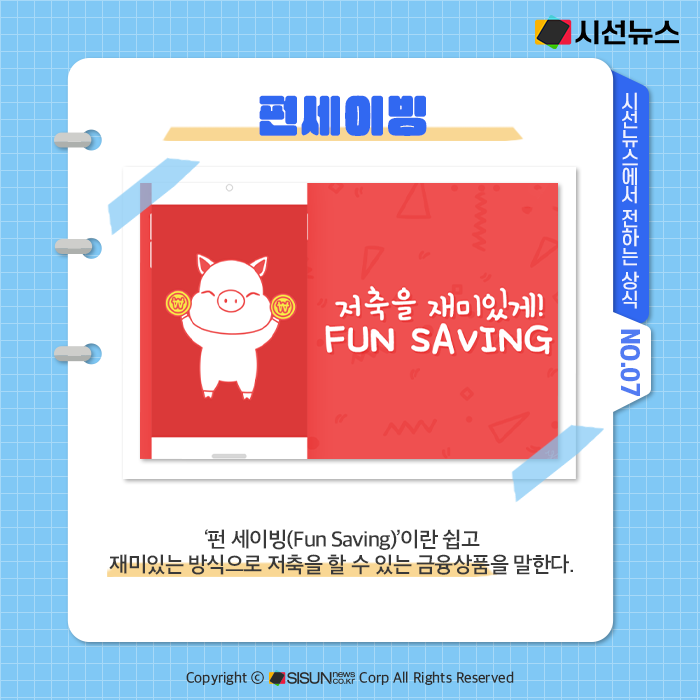 ‘펀 세이빙(Fun Saving)’이란 쉽고 재미있는 방식으로 저축을 할 수 있는 금융상품을 말한다. 금융에 ‘즐거움’을 접목해 금융소비자가 오락을 즐기듯 금융 서비스를 이용할 수 있도록 하자는 아이디어에서 시작됐다.