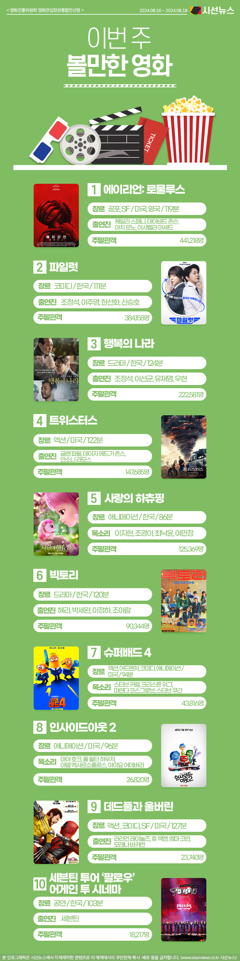 시선뉴스=김선희 proㅣ이번 주 볼만한 영화, 어떤 것들이 있을까요? 지난 2024년 08월 16일부터 2024년 08월 18까지 영화진흥위원회 영화관입장권통합전산망의 랭킹을 알려드립니다.