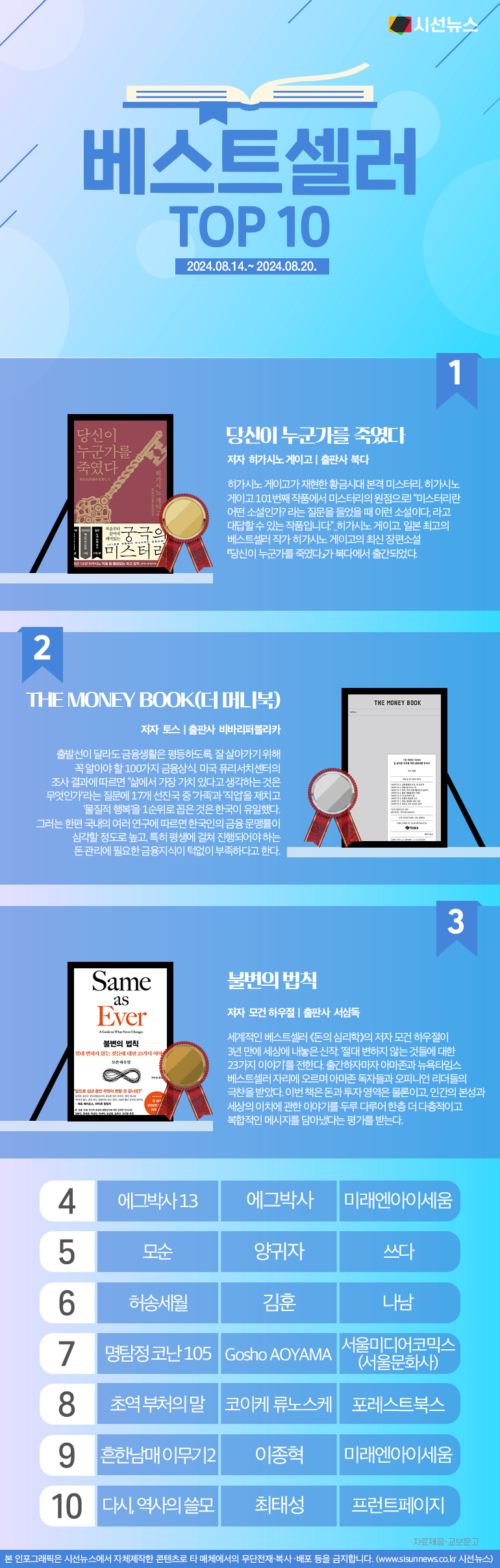 시선뉴스=김선희 proㅣ이번 주에는 어떤 책들이 독자들의 사랑을 받았을까요? 교보문고에서 2024년 08월 14일부터 08월 20일까지 영업점과 인터넷에서 도서와 eBook을 합산해 1주일 간 가장 많이 판매된 책 순위를 발표했습니다.