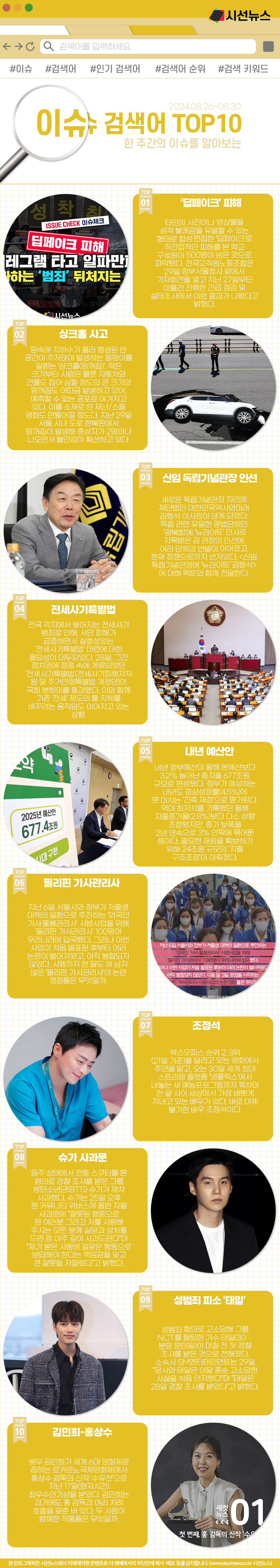시선뉴스=박진아 기자 / 디자인=김선희 proㅣ지난주 한주간의 이슈 Top10입니다. 지난주에는 어떤 키워드들이 이슈가 되었을까요?