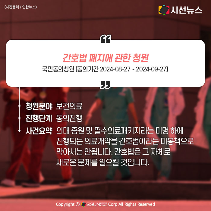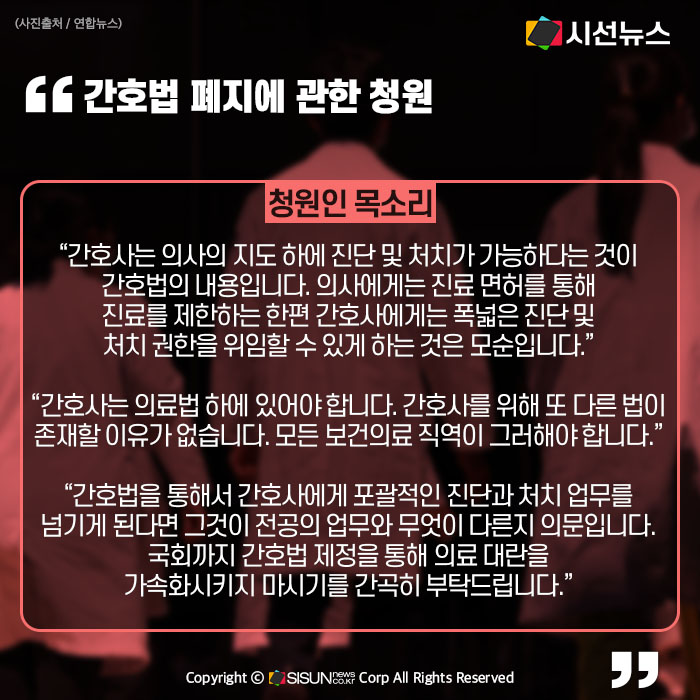 의대 증원 및 필수의료패키지라는 미명 하에 진행되는 의료개악을 간호법이라는 미봉책으로 막아서는 안됩니다. 간호법은 그 자체로 새로운 문제를 일으킬 것입니다.