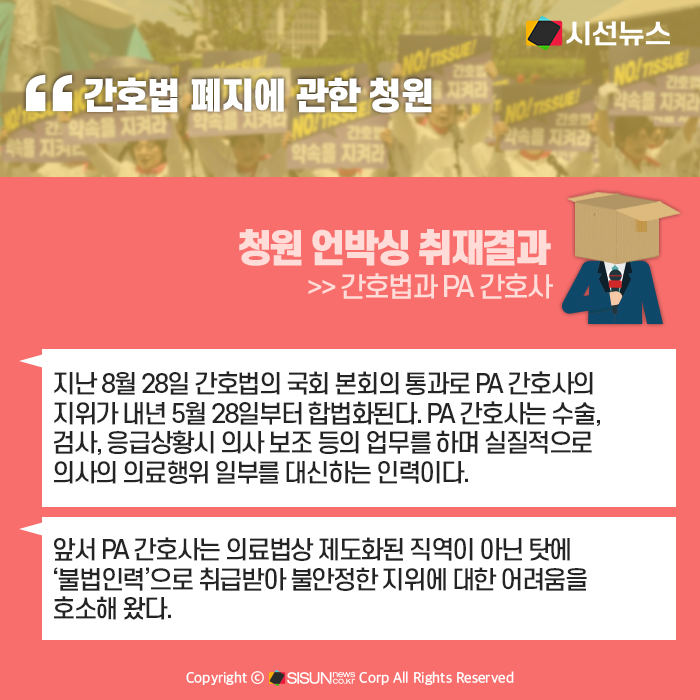 지난 8월 28일 간호법의 국회 본회의 통과로 PA 간호사의 지위가 내년 5월 28일부터 합법화된다. PA 간호사는 수술, 검사, 응급상황시 의사 보조 등의 업무를 하며 실질적으로 의사의 의료행위 일부를 대신하는 인력이다.