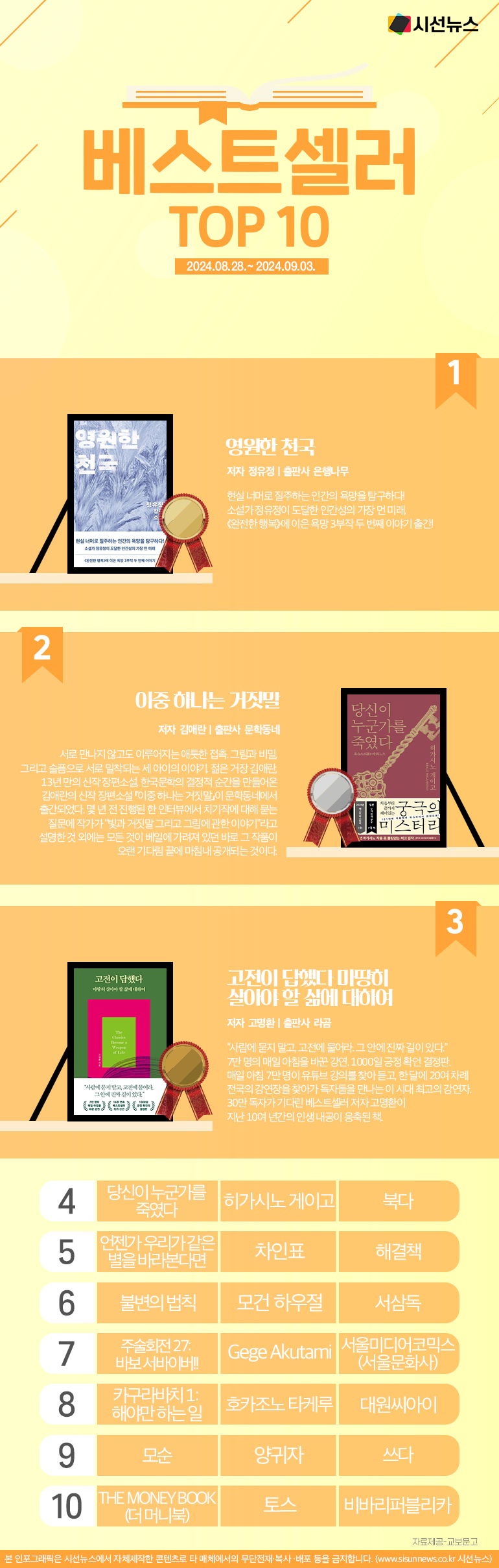 시선뉴스=김선희 proㅣ이번 주에는 어떤 책들이 독자들의 사랑을 받았을까요? 교보문고에서 2024년 08월 28일부터 09월 03일까지 영업점과 인터넷에서 도서와 eBook을 합산해 1주일 간 가장 많이 판매된 책 순위를 발표했습니다.