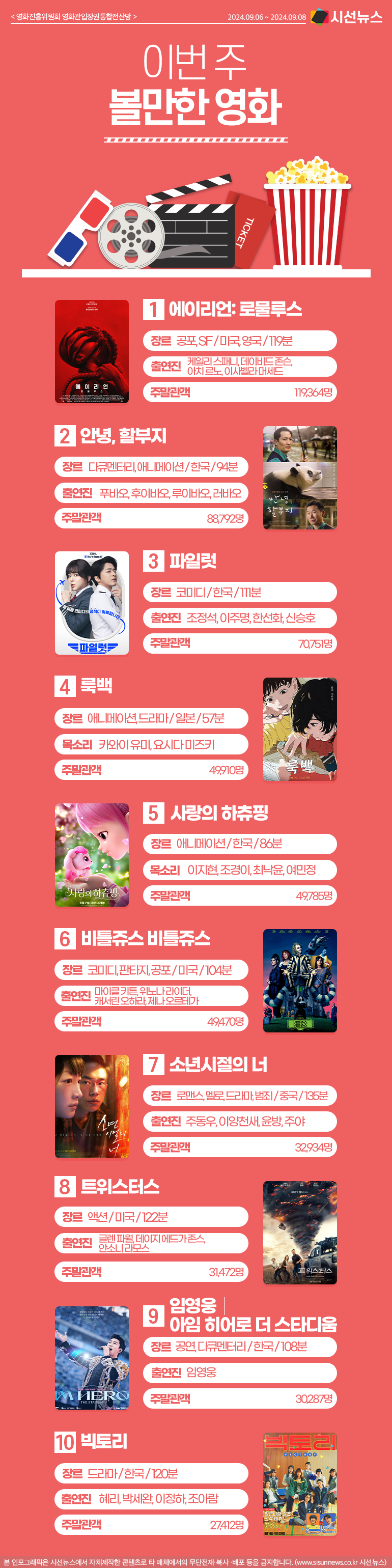 시선뉴스=김선희 proㅣ이번 주 볼만한 영화, 어떤 것들이 있을까요? 지난 2024년 09월 06일부터 2024년 09월 08까지 영화진흥위원회 영화관입장권통합전산망의 랭킹을 알려드립니다.