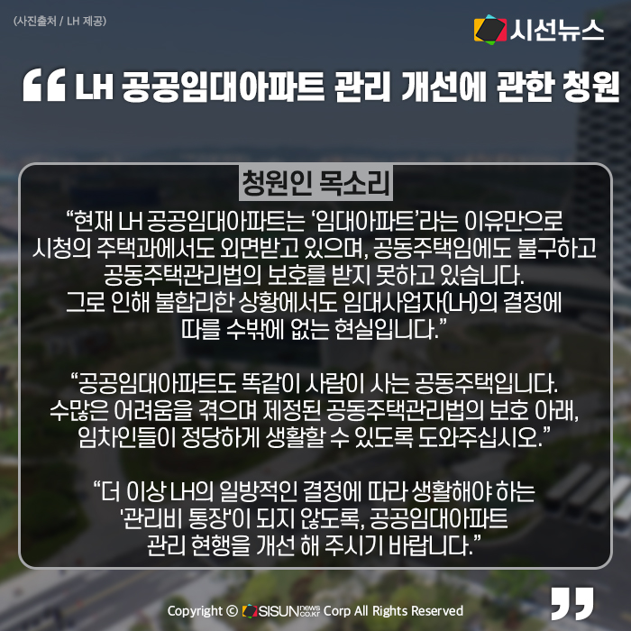 더 이상 LH의 일방적인 결정에 따라 생활해야 하는 '관리비 통장'이 되지 않도록, 공공임대아파트 관리 현행을 개선 해 주시기 바랍니다.
