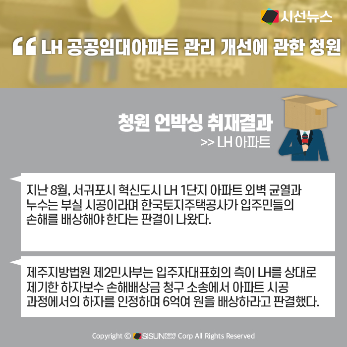 제주지방법원 제2민사부는 입주자대표회의 측이 LH를 상대로 제기한 하자보수 손해배상금 청구 소송에서 아파트 시공 과정에서의 하자를 인정하며 6억여 원을 배상하라고 판결했다.