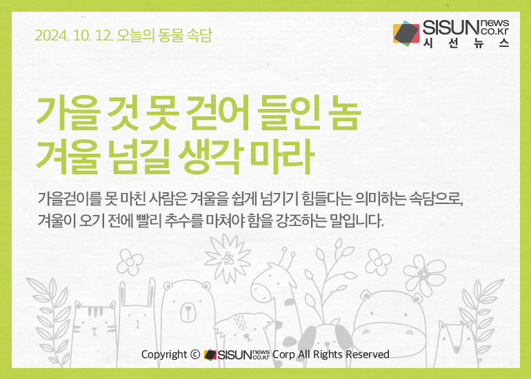 오늘의 네이처속담은 <가을 것 못 걷어 들인 놈 겨울 넘길 생각 마라>입니다.