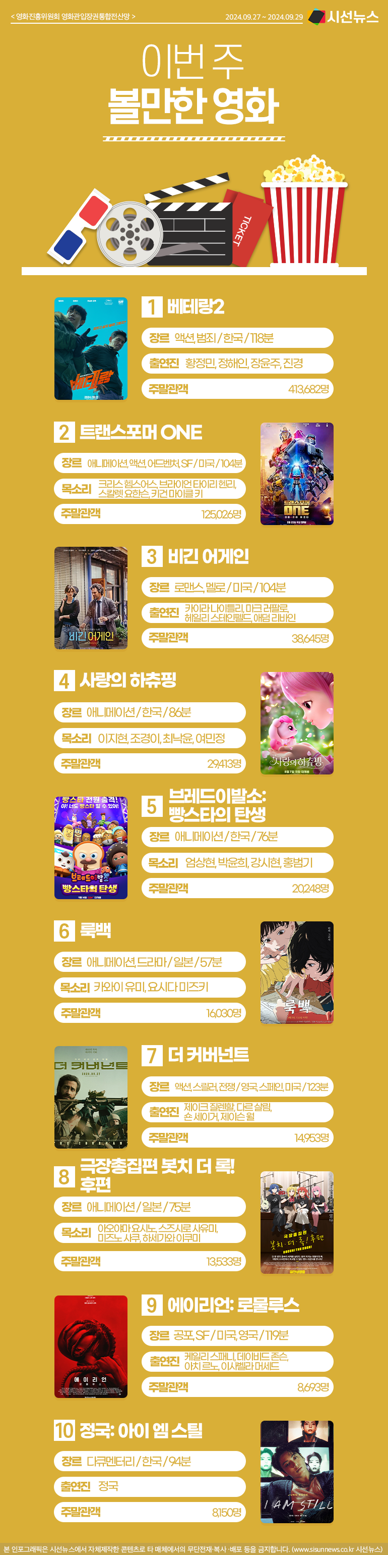 시선뉴스=김선희 proㅣ이번 주 볼만한 영화, 어떤 것들이 있을까요? 지난 2024년 09월 27일부터 2024년 09월 29까지 영화진흥위원회 영화관입장권통합전산망의 랭킹을 알려드립니다.