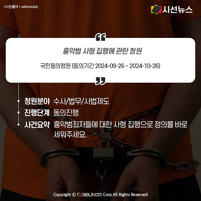 현행법은 판결이 확정된 날로부터 6개월 이내에 집행을 하도록 하는 등 사형 집행 절차에 관한 규정을 별도로 두고 있으나, 1997년 12월 30일 이후 사형 집행이 이루어지지 않았습니다. 이에 흉악범죄나 반인륜범죄를 저질러 사형이 확정된 자에 대한 사형 집행 의무를 우선하도록 강제하여 사법적 원칙과 정의를 바로 세우고 흉악범 등으로부터 공동체와 사회를 보호하여 국민들의 생명과 인권을 지키려는 것입니다. 아니면 사형 확정받으면 집행은 6개월 아니면 2년 쯤 집행을 해주셨으면 좋겠습니다.