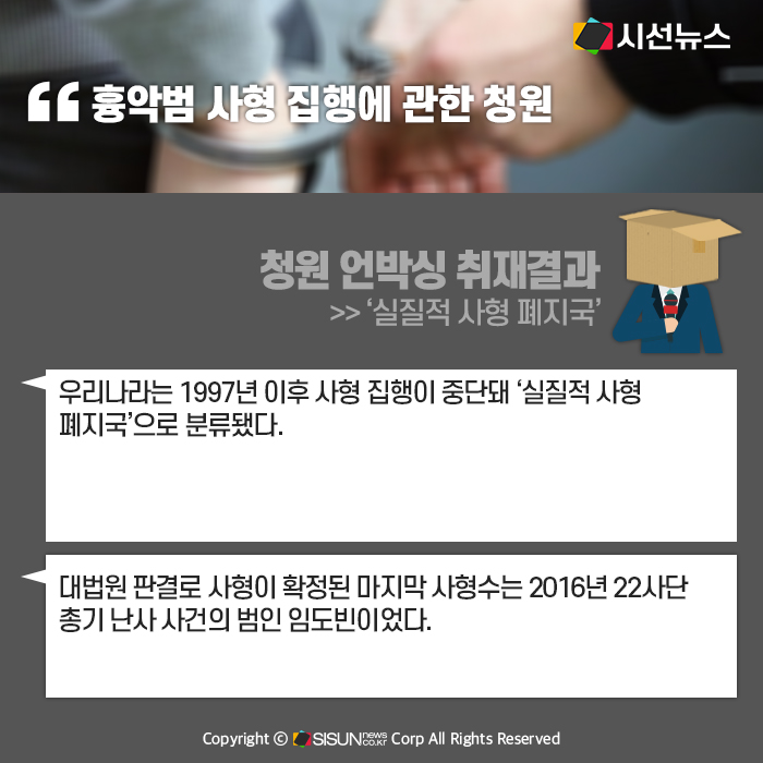 우리나라는 1997년 이후 사형 집행이 중단돼 ‘실질적 사형 폐지국’으로 분류됐다.