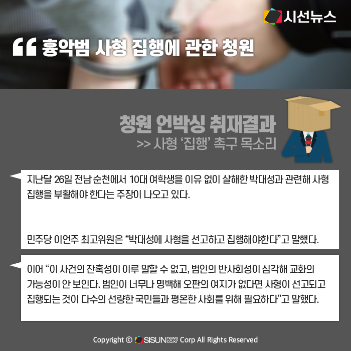 지난달 26일 전남 순천에서 10대 여학생을 이유 없이 살해한 박대성과 관련해 사형 집행을 부활해야 한다는 주장이 나오고 있다.