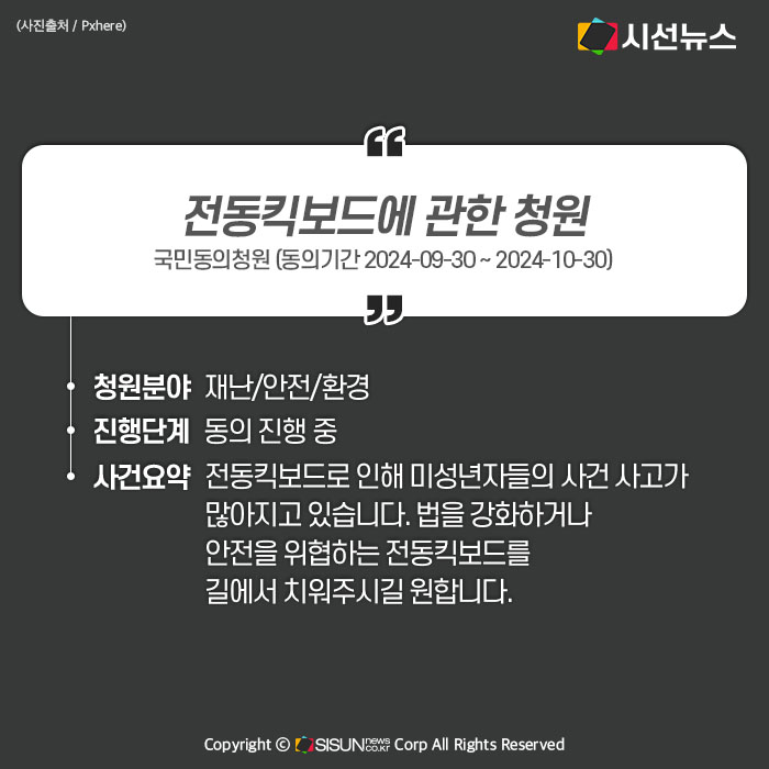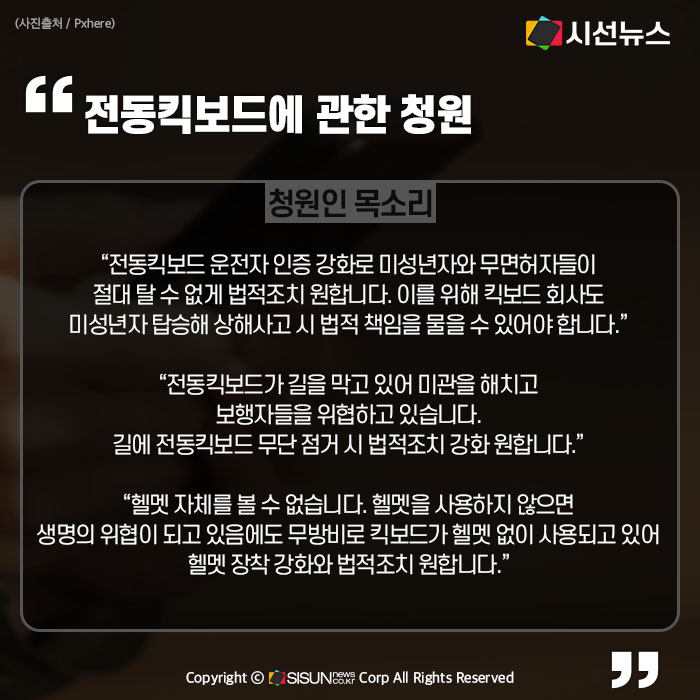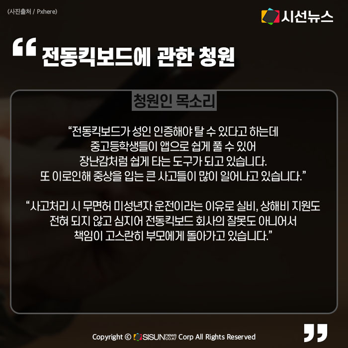 중고등학교 학생들이 전동킥보드를 타고 사고가 나면 미성년자라 사고처리 시 무면허 미성년자 운전이라는 이유로 실비, 상해비 지원도 전혀 되지 않고 심지어 전동킥보드 회사의 잘못도 아니어서 책임이 고스란히 부모에게 돌아가고 있습니다. 법을 강화하거나 안전을 위협하는 전동킥보드를 길에서 치워주시길 원합니다.