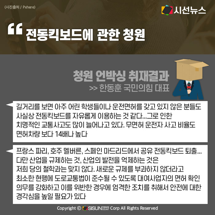 “프랑스 파리, 호주 멜버른, 스페인 마드리드에서 공유 전동킥보드가 퇴출...다만 산업을 규제하는 것, 산업의 발전을 억제하는 것은 저희 당의 철학과는 맞지 않다. 새로운 규제를 부과하지 않더라고 최소한 현행에 도로교통법이 준수될 수 있도록 대여사업자의 면허 확인 의무를 강화하고 이를 위반한 경우에 엄격한 조치를 취해서 안전에 대한 경각심을 높일 필요가 있다”
