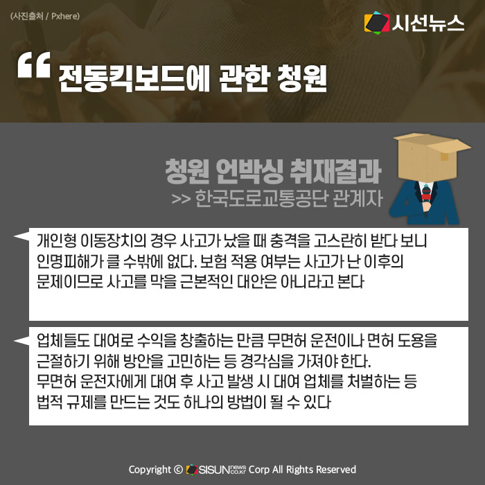 “업체들도 대여로 수익을 창출하는 만큼 무면허 운전이나 면허 도용을 근절하기 위해 방안을 고민하는 등 경각심을 가져야 한다. 무면허 운전자에게 대여 후 사고 발생 시 대여 업체를 처벌하는 등 법적 규제를 만드는 것도 하나의 방법이 될 수 있다”