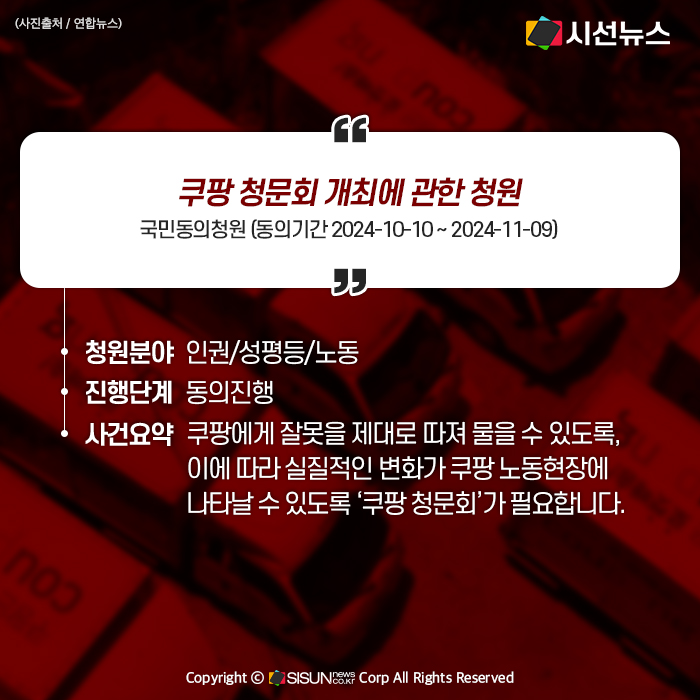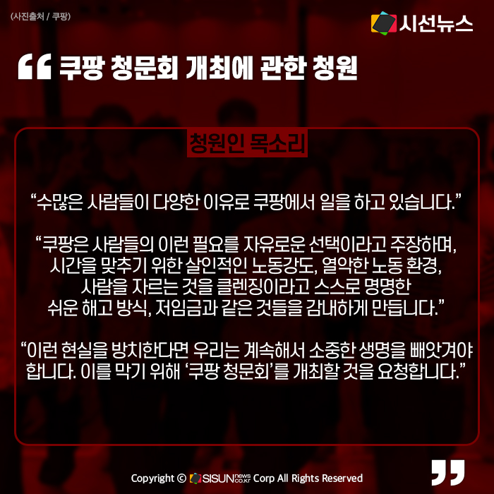 이런 현실을 방치한다면 우리는 계속해서 이윤만을 쫓는 쿠팡 같은 기업에 소중한 생명을 빼앗겨야 합니다. 이를 막기 위해 ‘쿠팡 청문회’를 개최할 것을 요청하는 청원을 하고자 합니다. 잠시 시간을 내어 동참해주십시오!
