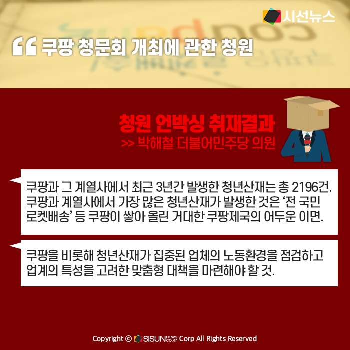 “쿠팡과 그 계열사(쿠팡풀필먼트서비스·쿠팡로지스틱스서비스)에서 최근 3년간 발생한 청년산재는 총 2196건. 쿠팡과 계열사에서 가장 많은 청년산재가 발생한 것은 ‘전 국민 로켓배송’ 등 쿠팡이 쌓아 올린 거대한 쿠팡제국의 어두운 이면.”