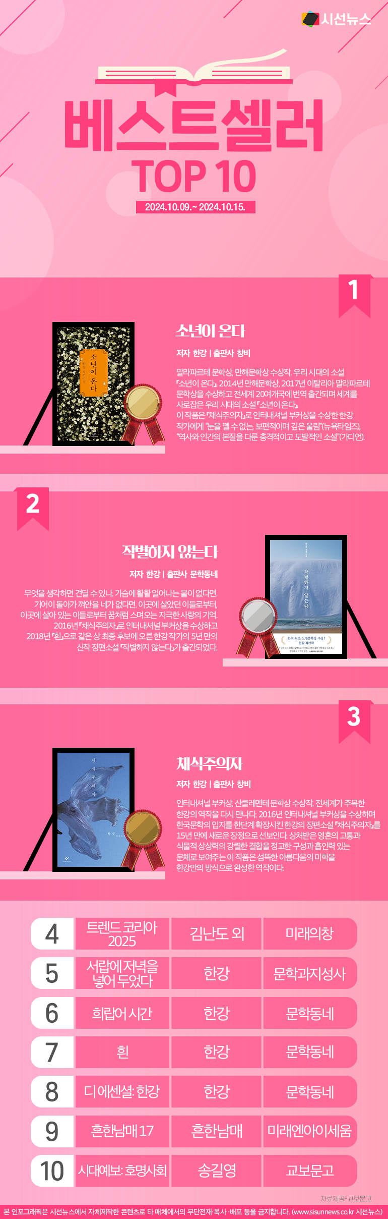 시선뉴스=김선희 proㅣ이번 주에는 어떤 책들이 독자들의 사랑을 받았을까요? 교보문고에서 2024년 10월 09일부터 10월 15일까지 영업점과 인터넷에서 도서와 eBook을 합산해 1주일 간 가장 많이 판매된 책 순위를 발표했습니다.