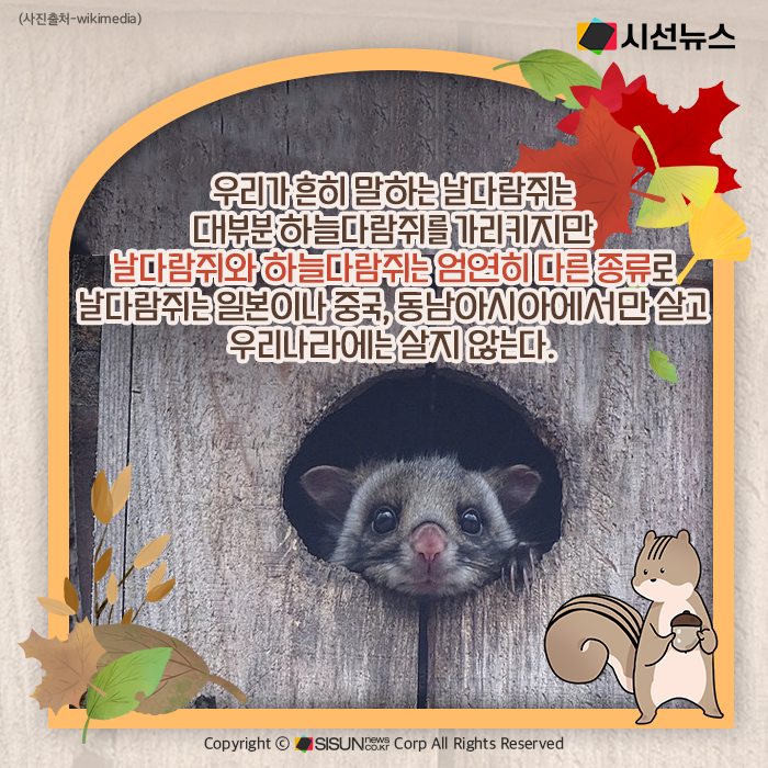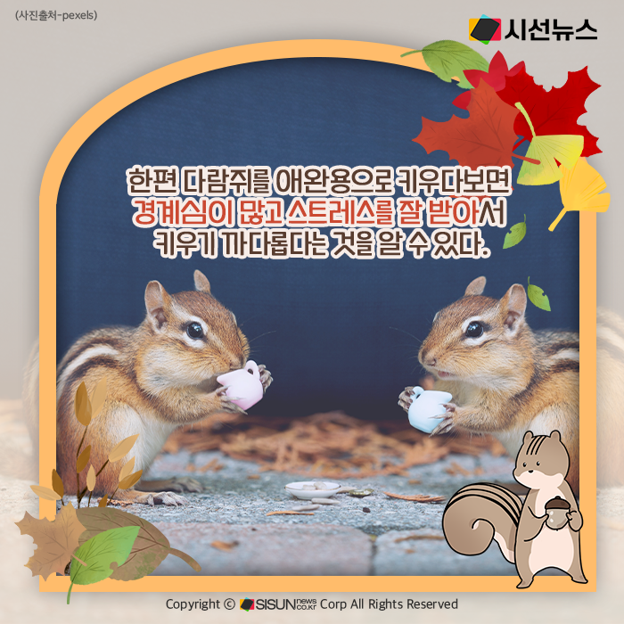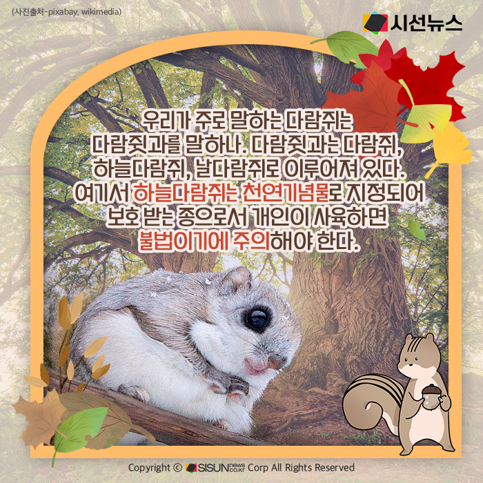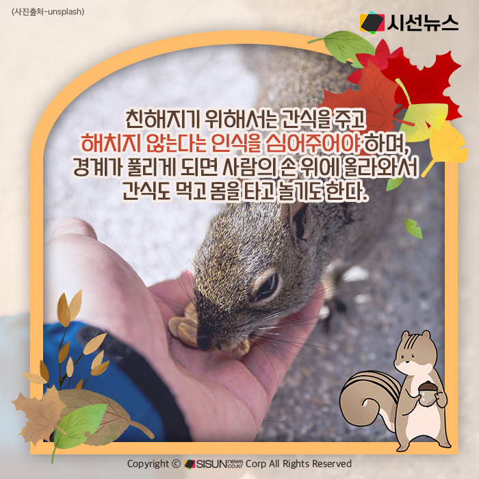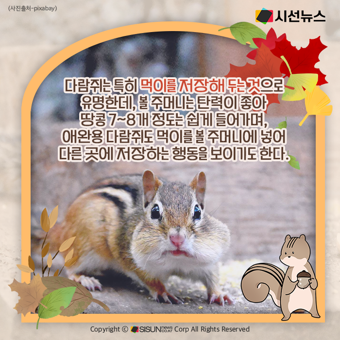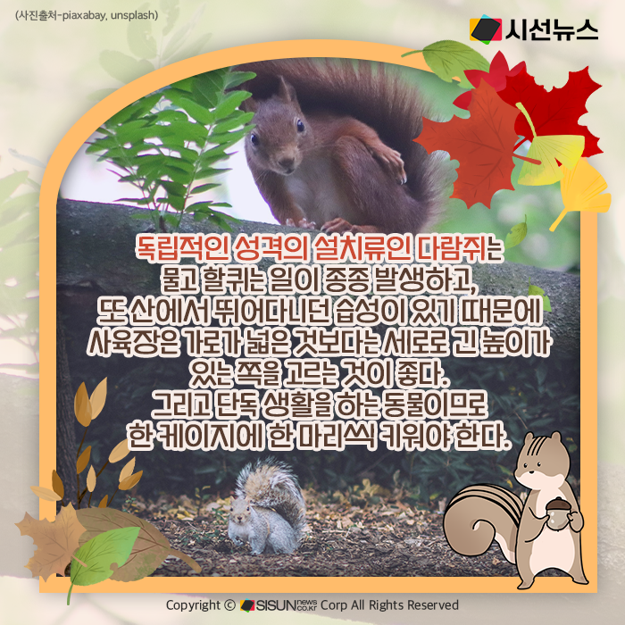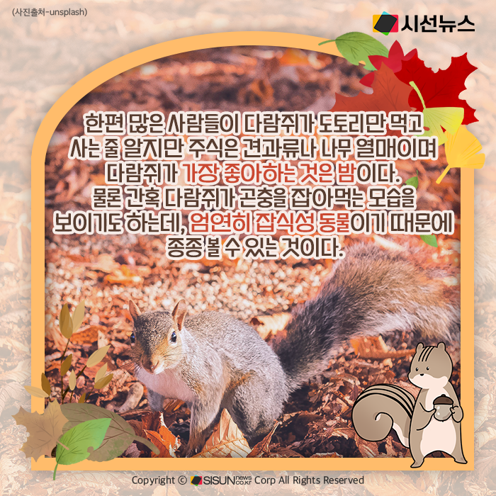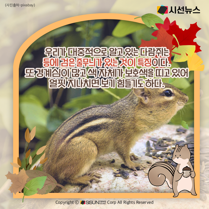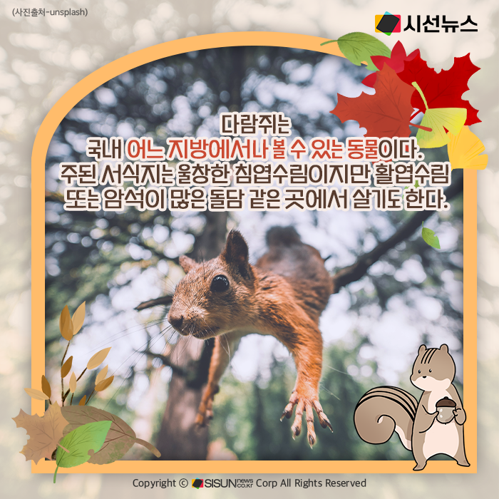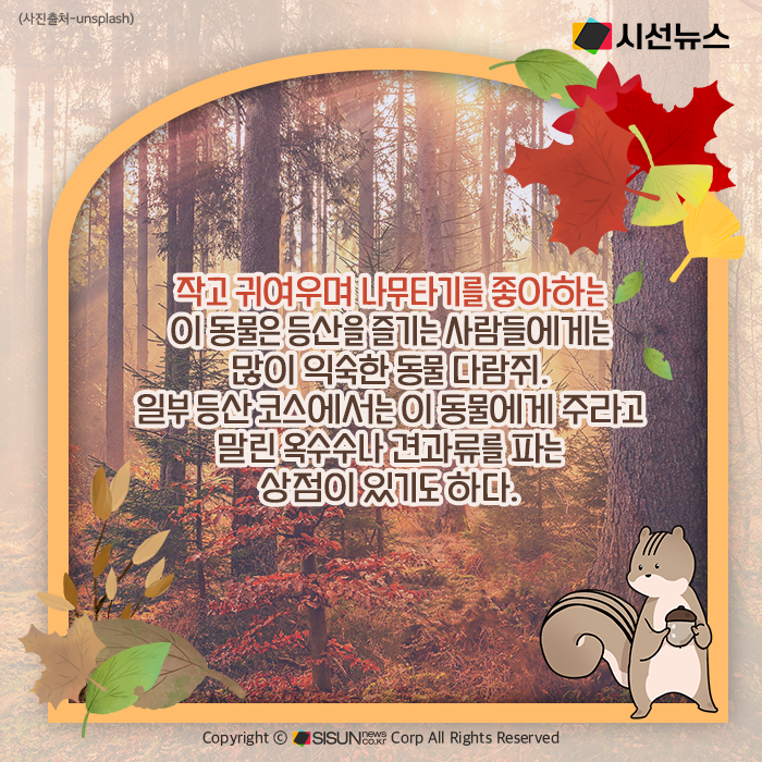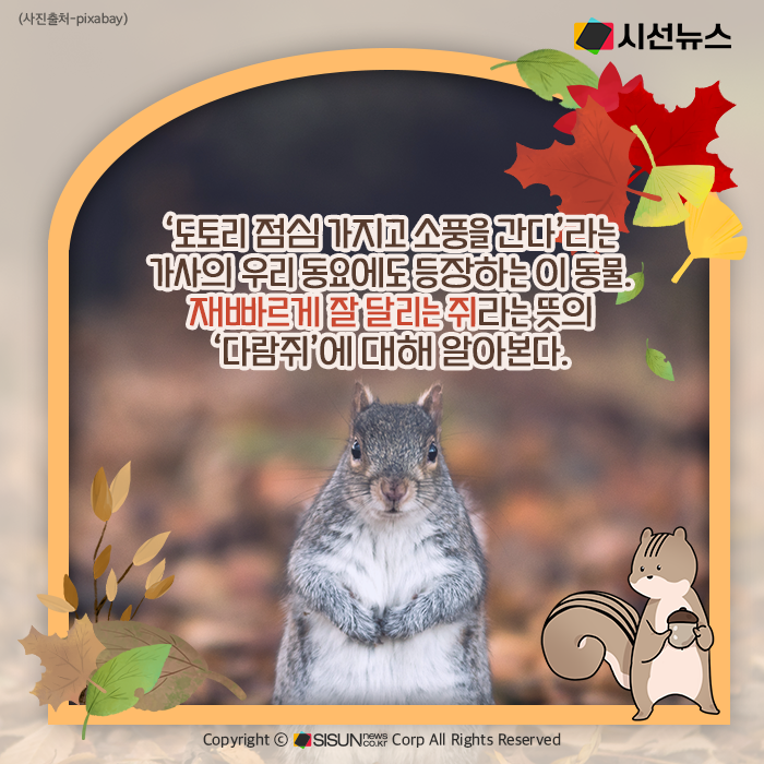 시선뉴스=박진아 기자 / 디자인=김선희 proㅣ작고 귀여우며 나무타기를 좋아하는 이 동물은 등산을 즐기는 사람들에게는 많이 익숙한 동물 다람쥐. 일부 등산 코스에서는 이 동물에게 주라고 말린 옥수수나 견과류를 파는 상점이 있기도 하다. ‘도토리 점심 가지고 소풍을 간다’라는 가사의 우리 동요에도 등장하는 이 동물. 재빠르게 잘 달리는 쥐라는 뜻의 ‘다람쥐’에 대해 알아본다.