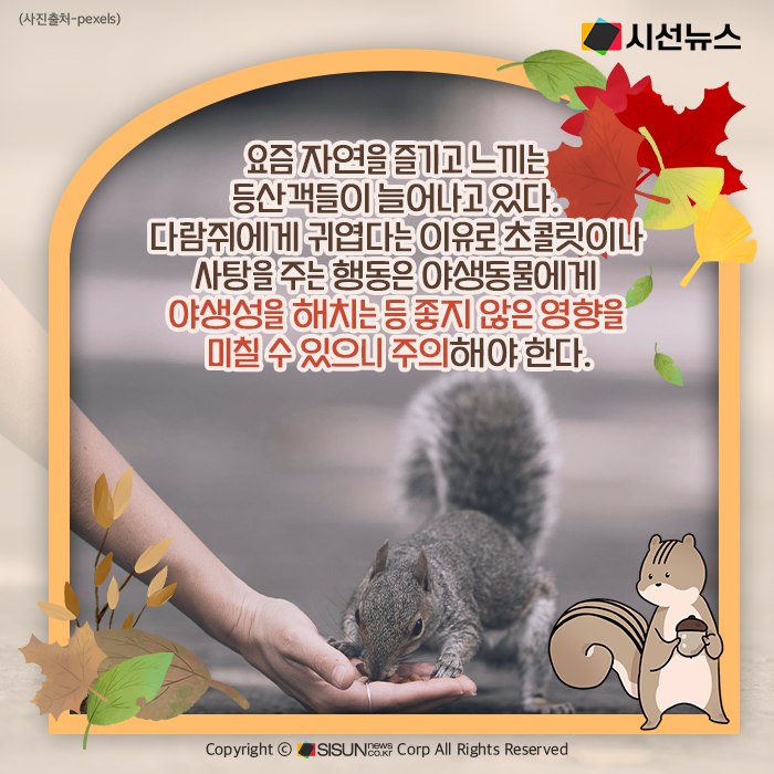 요즘 자연을 즐기고 느끼는 등산객들이 늘어나고 있다. 다람쥐에게 귀엽다는 이유로 초콜릿이나 사탕을 주는 행동은 야생동물에게 야생성을 해치는 등 좋지 않은 영향을 미칠 수 있으니 주의해야 한다.