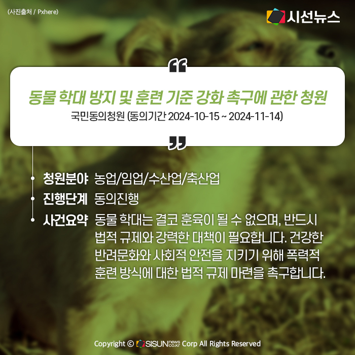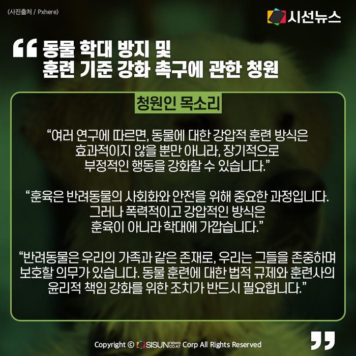 강압적인 훈련 방식은 동물에게 신체적, 정신적 고통을 줄 뿐만 아니라, 훈육이라는 명분으로 학대를 정당화할 수 있는 위험이 큽니다. 반려동물은 우리의 가족과 같은 존재로, 우리는 그들을 존중하며 보호할 의무가 있습니다. 이번 사건을 계기로, 동물 훈련에 대한 법적 규제와 훈련사의 윤리적 책임 강화를 위한 조치가 반드시 필요합니다. 훈련 기준 강화와 함께, 이러한 방식이 더 이상 정당화되지 않도록 관련 법적 대책을 마련해 주시기를 강력히 촉구합니다.