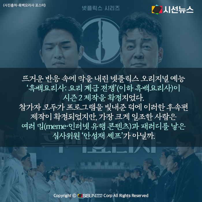 시선뉴스=양원민 기자ㅣ뜨거운 반응 속에 막을 내린 넷플릭스 오리지널 예능 ‘흑백요리사: 요리 계급 전쟁’(이하 흑백요리사)이 시즌 2 제작을 확정지었다. 참가자 모두가 프로그램을 빛내준 덕에 이러한 후속편 제작이 확정되었지만, 가장 크게 일조한 사람은 여러 밈(meme·인터넷 유행 콘텐츠)과 패러디를 낳은 심사위원 ‘안성재 셰프’가 아닐까. 전세계가 주목하고 있는 스타 셰프 ‘안성재’를 조명한다.