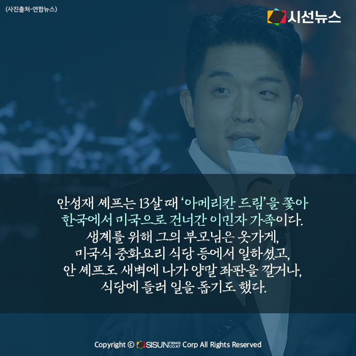 안성재 셰프는 13살 때 ‘아메리칸 드림’을 쫓아 한국에서 미국으로 건너간 이민자 가족이었다. 생계를 위해 그의 부모님은 옷가게, 미국식 중화요리 식당 등에서 일하셨고, 안 셰프도 새벽에 나가 양말 좌판을 깔거나, 식당에 들러 일을 돕기도 했다.