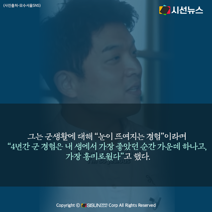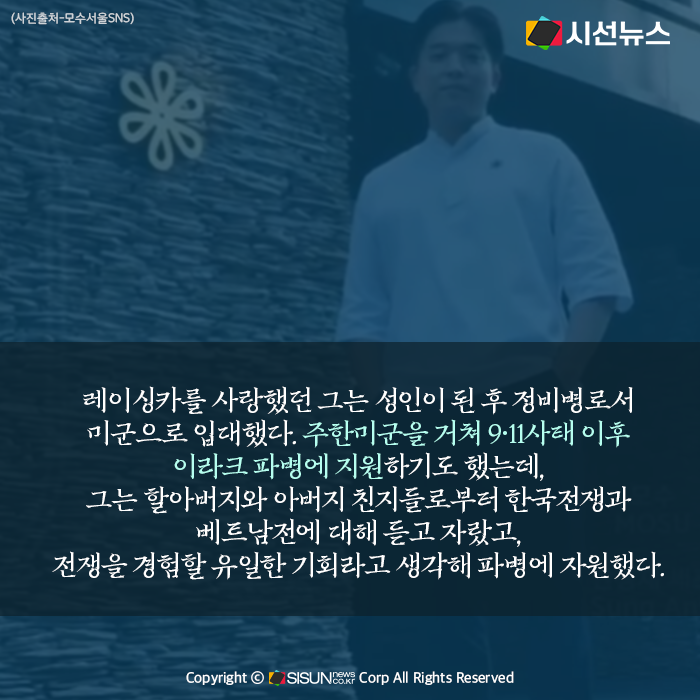 레이싱카를 사랑했던 그는 성인이 된 후 정비병로서 미군으로 입대했다. 주한미군을 거쳐 9·11사태 이후 이라크 파병에 지원하기도 했는데, 그는 할아버지와 아버지 친지들로부터 한국전쟁과 베트남전에 대해 듣고 자랐고, 전쟁을 경험할 유일한 기회라고 생각해 파병에 자원했다고 한다. 그는 군생활에 대해 “눈이 뜨여지는 경험”이라며 “4년간 군 경험은 내 생에서 가장 좋았던 순간 가운데 하나고, 가장 흥미로웠다”고 했다.