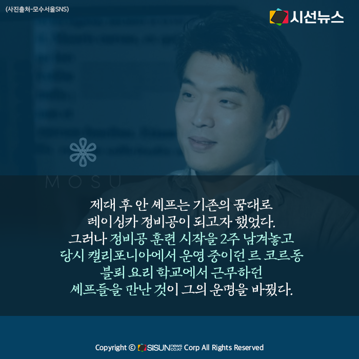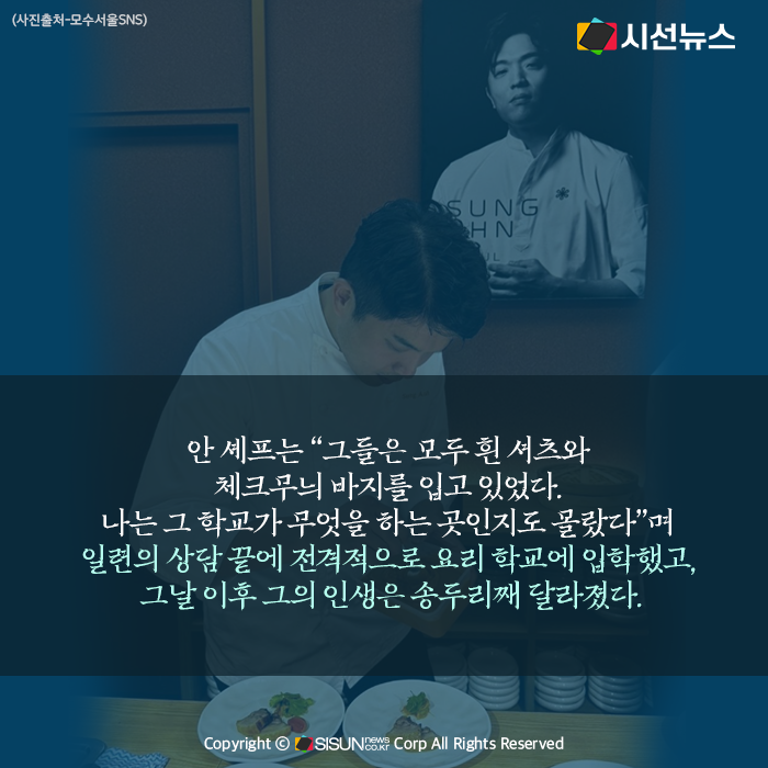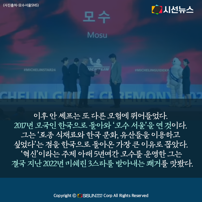 이후 안 셰프는 또 다른 모험에 뛰어들었다. 2017년 모국인 한국으로 돌아와 ‘모수 서울’을 연 것이다. 그는 ‘토종 식재료와 한국 문화, 유산들을 이용하고 싶었다’는 점을 한국으로 돌아온 가장 큰 이유로 꼽았다. ‘혁신’이라는 주제 아래 5년여간 모수를 운영한 그는 결국 지난 2022년 미쉐린 3스타를 받아내는 쾌거를 맛봤다.