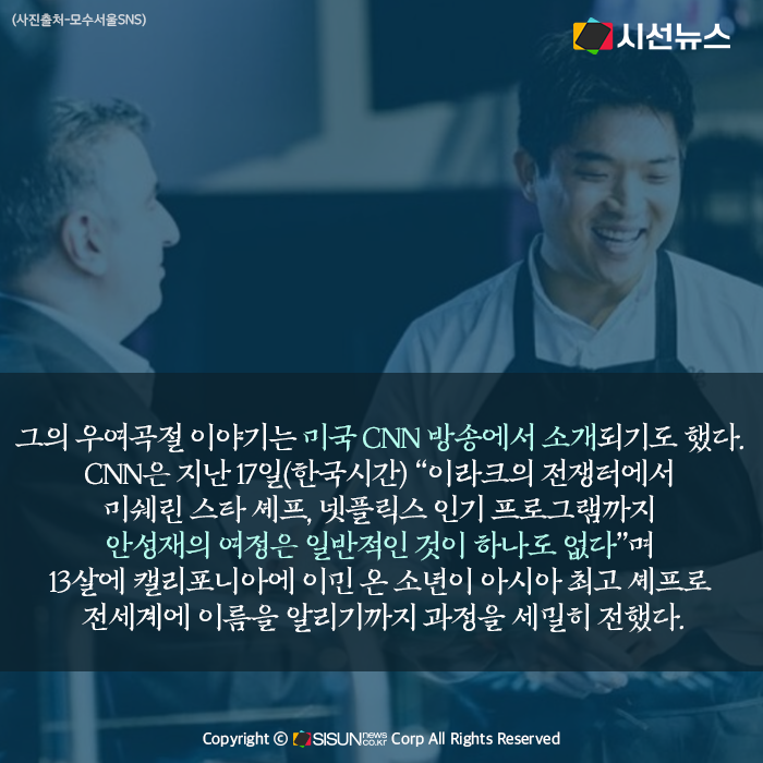 이러한 그의 우여곡절 이야기는 미국 CNN 방송에서 소개되기도 했다. CNN은 지난 17일(한국시간) “이라크의 전쟁터에서 미쉐린 스타 셰프, 넷플릭스 인기 프로그램까지 안성재의 여정은 일반적인 것이 하나도 없다”며 13살의 나이에 캘리포니아에 이민 온 소년이 아시아 최고 셰프로 전세계에 이름을 알리기까지 과정을 세밀히 전했다.