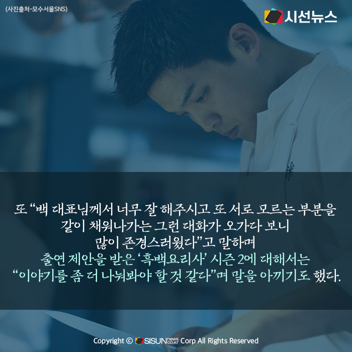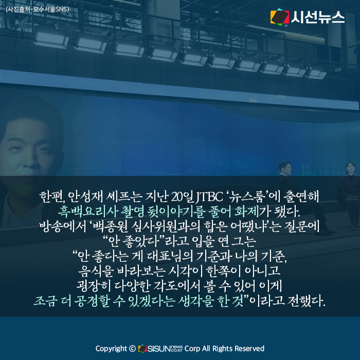 한편, 안성재 셰프는 지난 20일 JTBC ‘뉴스룸’에 출연해 흑백요리사 촬영 뒷이야기를 풀어 화제가 됐다. 방송에서 ‘백종원 심사위원과의 합은 어땠냐’는 질문에 “안 좋았다”라고 입을 연 그는 “안 좋다는 게 대표님의 기준과 나의 기준, 음식을 바라보는 시각이 한쪽이 아니고 굉장히 다양한 각도에서 볼 수 있어 이게 조금 더 공정할 수 있겠다는 생각을 한 것”이라며 “백 대표님께서 너무 잘 해주시고 또 서로 모르는 부분을 같이 채워나가는 그런 대화가 오가다 보니 많이 존경스러웠다”고 말했다.