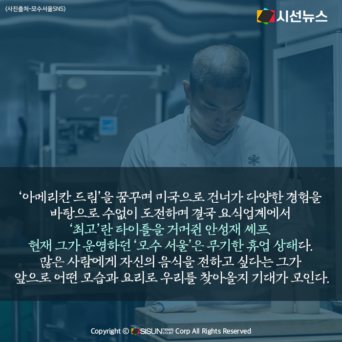 ‘아메리칸 드림’을 꿈꾸며 미국으로 건너가 다양한 경험을 바탕으로 수없이 도전하며 결국 요식업계에서 ‘최고’란 타이틀을 거머쥔 안성재 셰프. 현재 그가 운영하던 ‘모수 서울’은 무기한 휴업에 돌입한 상태다. 많은 사람에게 자신의 음식을 전하고 싶다는 그가 앞으로 어떤 모습과 요리로 우리를 찾아올지 기대가 모인다.