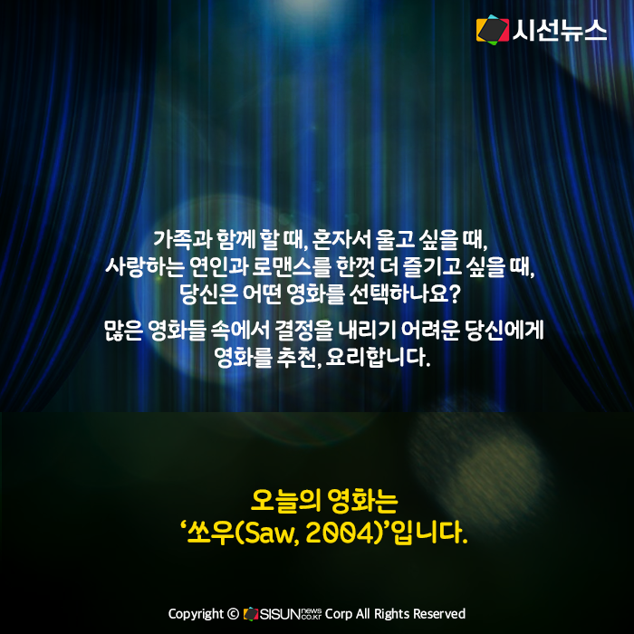 가족과 함께 할 때, 혼자서 울고 싶을 때, 사랑하는 연인과 로맨스를 한껏 더 즐기고 싶을 때, 당신은 어떤 영화를 선택하나요? 많은 영화들 속에서 결정을 내리기 어려운 당신에게 영화를 추천, 요리합니다. 오늘의 영화는 ‘쏘우(Saw, 2004)’입니다.