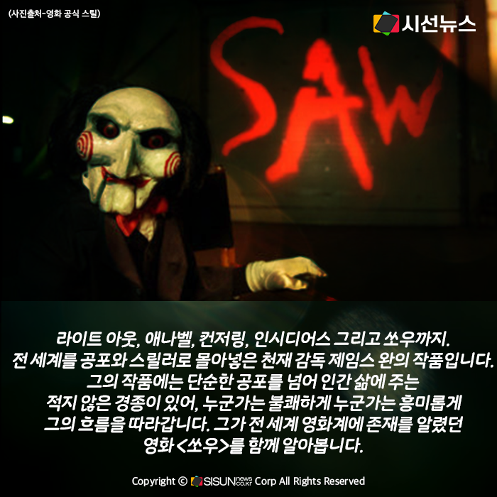 라이트 아웃, 애나벨, 컨저링, 인시디어스 그리고 쏘우까지. 전 세계를 공포와 스릴러로 몰아넣은 천재 감독 제임스 완의 작품입니다. 그의 작품에는 단순한 공포를 넘어 인간 삶에 주는 적지 않은 경종이 있어, 누군가는 불쾌하게 누군가는 흥미롭게 그의 흐름을 따라갑니다. 그가 전 세계 영화계에 존재를 알렸던 영화 <쏘우>를 함께 알아봅니다.