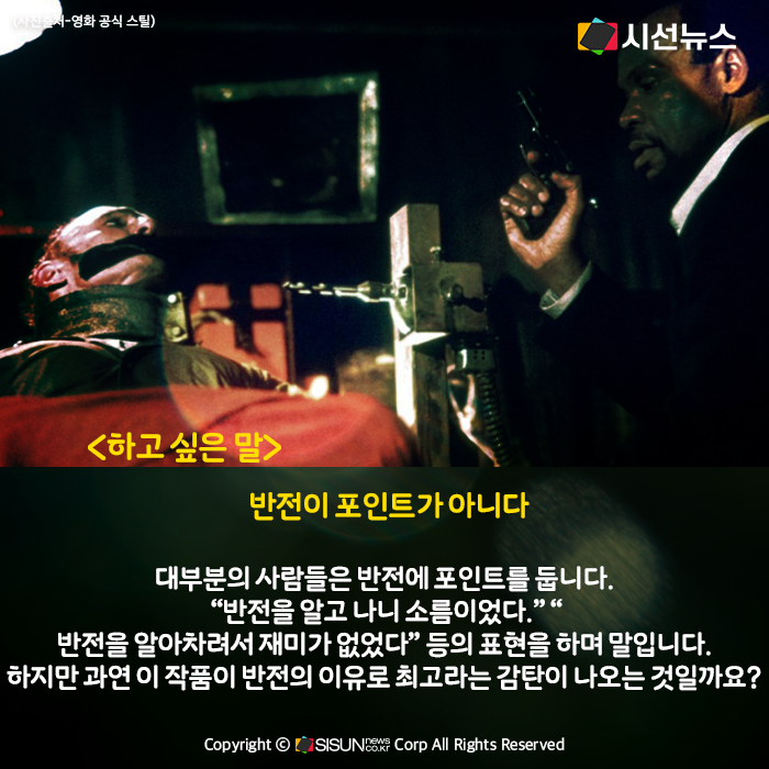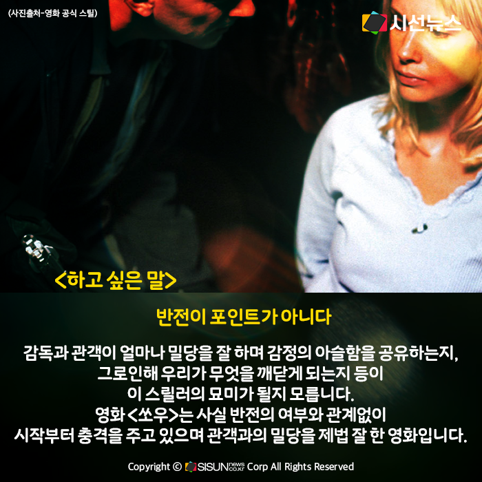 대부분의 사람들은 반전에 포인트를 둡니다. “반전을 알고 나니 소름이었다.” “반전을 알아차려서 재미가 없었다” 등의 표현을 하며 말입니다. 하지만 과연 이 작품이 반전의 이유로 최고라는 감탄이 나오는 것일까요? 감독과 관객이 얼마나 밀당을 잘 하며 감정의 아슬함을 공유하는지, 그로인해 우리가 무엇을 깨닫게 되는지 등이 이 스릴러의 묘미가 될지 모릅니다. 영화 <쏘우>는 사실 반전의 여부와 관계없이 시작부터 충격을 주고 있으며 관객과의 밀당을 제법 잘 한 영화입니다.