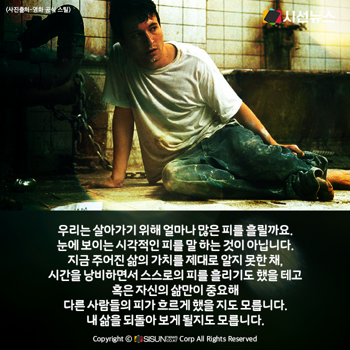 우리는 살아가기 위해 얼마나 많은 피를 흘릴까요. 눈에 보이는 시각적인 피를 말 하는 것이 아닙니다. 지금 주어진 삶의 가치를 제대로 알지 못한 채, 시간을 낭비하면서 스스로의 피를 흘리기도 했을 테고 혹은 자신의 삶만이 중요해 다른 사람들의 피가 흐르게 했을 지도 모릅니다. 내 삶을 되돌아 보게 될지도 모릅니다.