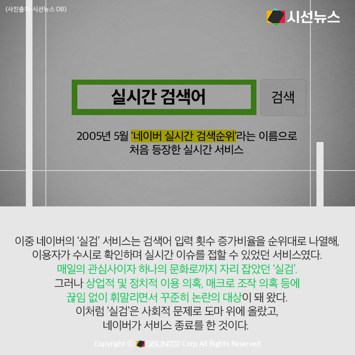 이중 네이버의 ‘실검’ 서비스는 검색어 입력 횟수 증가비율을 순위대로 나열해, 이용자가 수시로 확인하며 실시간 이슈를 접할 수 있었던 서비스였다. 매일의 관심사이자 하나의 문화로까지 자리 잡았던 ‘실검’은 그러나, 상업적 및 정치적 이용 의혹, 매크로 조작 의혹 등에 끊임 없이 휘말리면서 꾸준히 논란의 대상이 돼 왔다. 이처럼 ‘실검’이 사회적 문제로 도마 위에 올랐고, 네이버가 서비스 종료를 한 것이다.