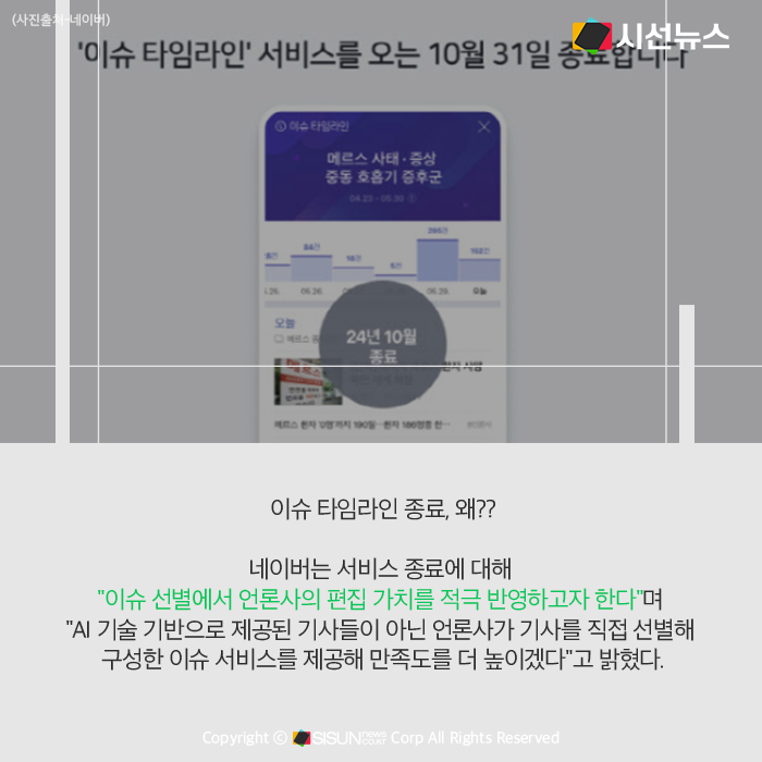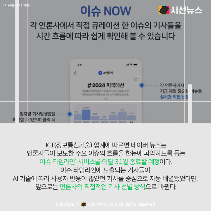ICT(정보통신기술) 업계에 따르면 네이버 뉴스는 언론사들이 보도한 주요 이슈의 흐름을 한눈에 파악하도록 돕는 '이슈 타임라인' 서비스를 이달 31일 종료할 예정이다. 이로써 2019년 8월 네이버의 모바일 'MY뉴스'에서 시작한 이슈 타임라인은 5년여 만에 끝난다. 이슈 타임라인에 노출되는 기사들이 AI 기술에 따라 사용자 반응이 많았던 기사를 중심으로 자동 배열됐었다면, 앞으로는 언론사의 직접적인 기사 선별 방식으로 바뀐다.