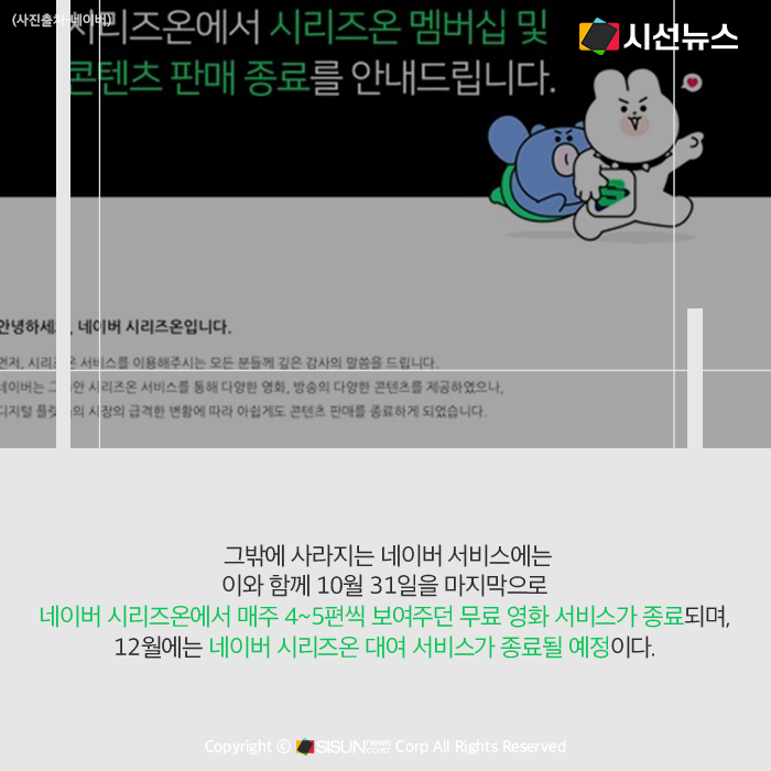이와 함께 10월 31일을 마지막으로 네이버 시리즈온에서 매주 4~5편씩 보여주던 무료 영화 서비스가 종료되며, 12월에는 네이버 시리즈온 대여 서비스가 종료될 예정이다.