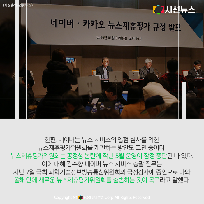 한편, 네이버는 뉴스 서비스의 입점 심사를 위한 뉴스제휴평가위원회를 개편하는 방안도 고민 중이다. 뉴스제휴평가위원회는 공정성 논란에 작년 5월 운영이 잠정 중단된 바 있다. 이에 대해 김수향 네이버 뉴스 서비스 총괄 전무는 지난 7일 국회 과학기술정보방송통신위원회의 국정감사에 증인으로 나와 올해 안에 새로운 뉴스제휴평가위원회를 출범하는 것이 목표라고 말했다.