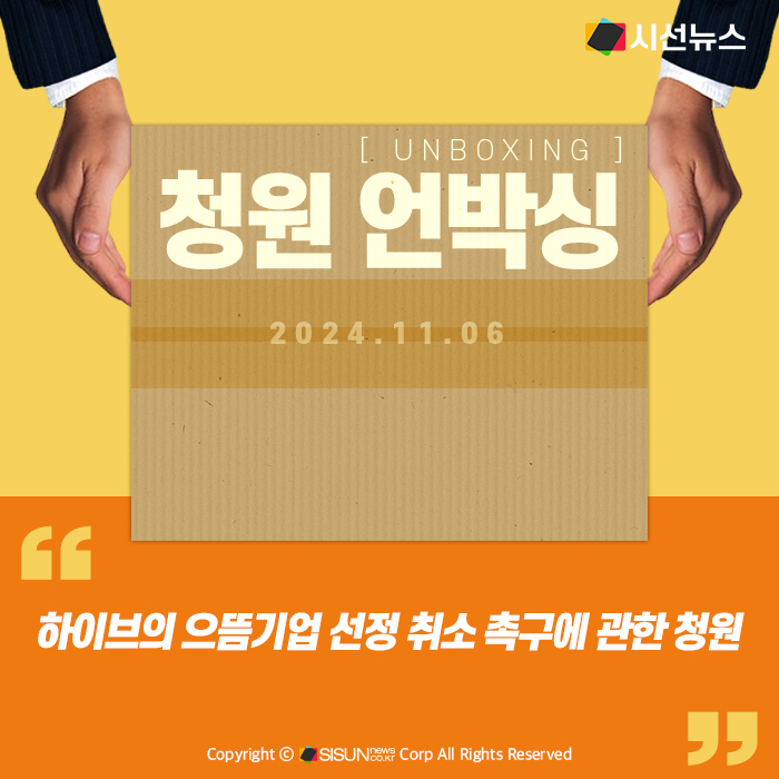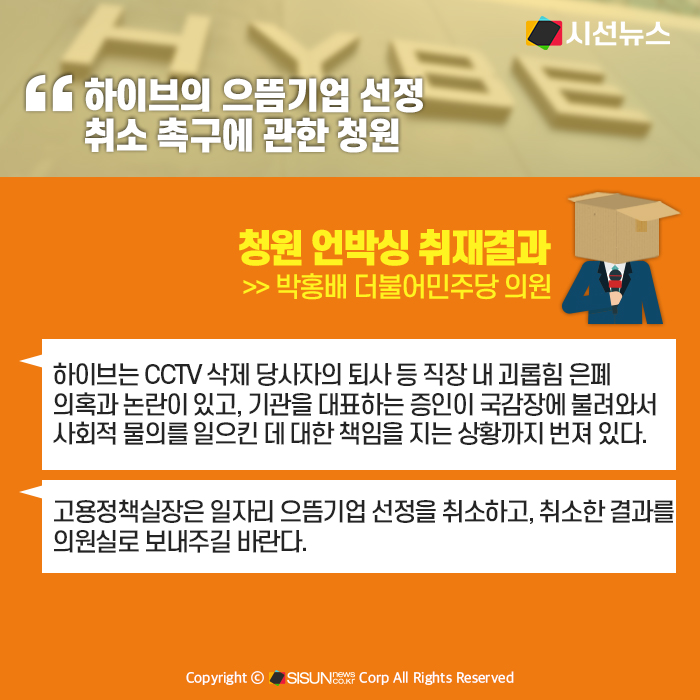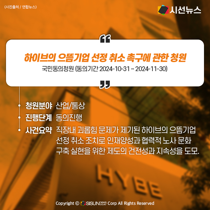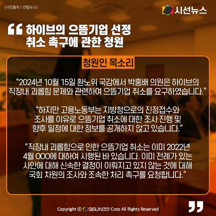 - 직장내 괴롭힘 문제가 제기된 하이브의 으뜸기업 선정 취소 처리 촉구