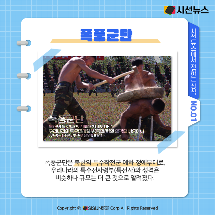 폭풍군단은 북한의 특수작전군 예하 정예부대로, 우리나라의 특수전사령부(특전사)와 성격은 비슷하나 규모는 더 큰 것으로 알려졌다. 폭풍군단 예하부대로는 ‘번개’로 불리는 경보병여단과 ‘우뢰’로 불리는 항공육전단, ‘벼락’으로 불리는 저격여단 등 10개 여단이 있고, 전체 병력 규모는 4만∼8만명으로 추정된다.