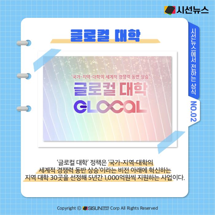 ‘글로컬 대학’ 정책은 ‘국가-지역-대학의 세계적 경쟁력 동반 상승’이라는 비전 아래에 혁신하는 지역 대학 30곳을 선정해 5년간 1,000억원씩 지원하는 사업이다. 정부는 대학·지자체·기업이 혁신 전략을 함께 세워 제출하면, 정부·산업계와 전문가로 구성된 글로컬대학위원회에서 대학이 제시한 비전이 얼마나 혁신적이고 의지가 있는지 등을 고려해 글로컬 대학으로 지정한다.