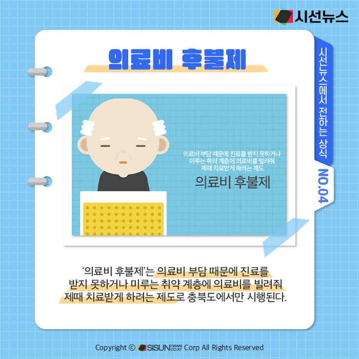 ‘의료비 후불제’는 의료비 부담 때문에 진료를 받지 못하거나 미루는 취약 계층에 의료비를 빌려줘 제때 치료받게 하려는 제도로 충북도에서만 시행된다. 이는 치과의사 출신인 김영환 충북지사의 공약사업으로, 돈이 없는 환자를 대신해 농협이 최대 300만 원까지 먼저 의료비를 내주고, 환자는 이를 36개월 무이자로 장기 분할 상환하는 방식이다.