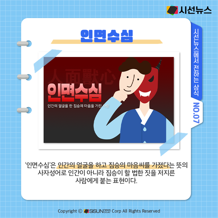 ‘인면수심’은 인간의 얼굴을 하고 짐승의 마음씨를 가졌다는 뜻의 사자성어로 인간이 아니라 짐승이 할 법한 짓을 저지른 사람에게 붙는 표현이다. 특히 흉악범이나 친인척, 소아를 대상으로 한 성범죄자들을 대상으로 많이 사용하고 있다.