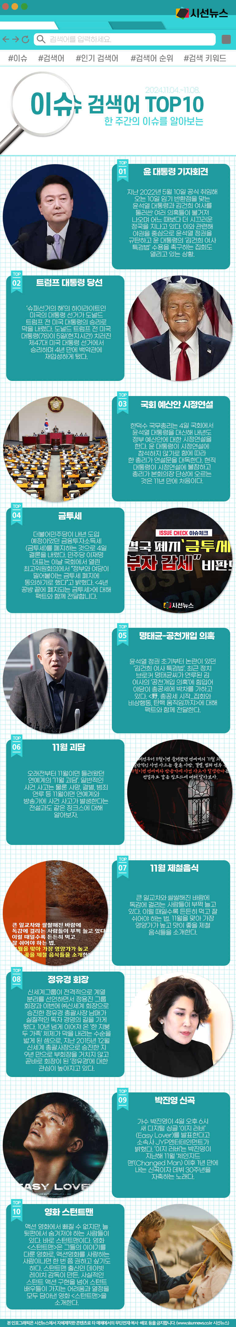 시선뉴스=박진아 기자 / 디자인=김선희 proㅣ지난주 한주간의 이슈 Top10입니다. 지난주에는 어떤 키워드들이 이슈가 되었을까요?