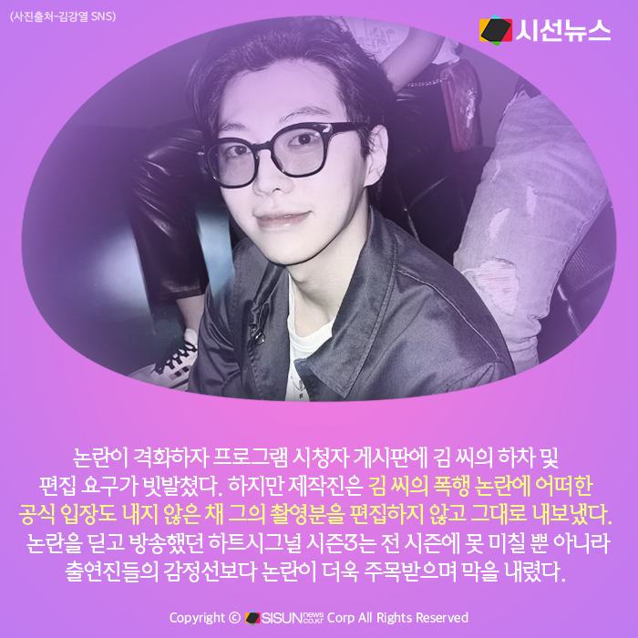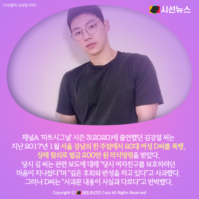 채널A ‘하트시그널’ 시즌 3(2020)에 출연했던 김강열 씨는 지난 2017년 1월 서울 강남의 한 주점에서 20대 여성 D씨를 폭행, 상해 혐의로 벌금 200만 원 약식명령을 받았다. 당시 김 씨는 관련 보도에 대해 “당시 여자친구를 보호하려던 마음이 지나쳤다”며 “깊은 후회와 반성을 하고 있다”고 사과했다. 그러나 D씨는 “사과문 내용이 사실과 다르다”고 반박했다.