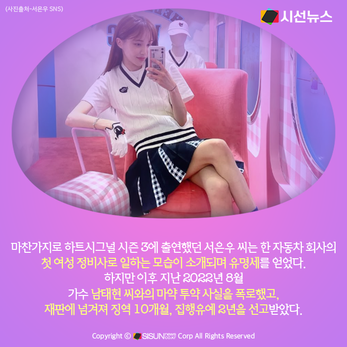 마찬가지로 하트시그널 시즌 3에 출연했던 서은우 씨는 한 자동차 회사의 첫 여성 정비사로 일하는 모습이 소개되며 유명세를 얻었다. 하지만 이후 지난 2022년 8월 가수 남태현 씨와의 마약 투약 사실을 폭로했고, 재판에 넘겨져 징역 10개월, 집행유예 2년을 선고받았다.