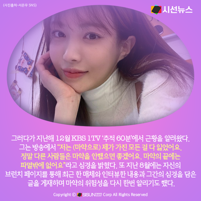 그러다가 지난해 12월 1일에 방송된 KBS 1TV ‘추적 60분’에서 근황을 알려왔다. 그는 방송에서 “저는 (마약으로) 제가 가진 모든 걸 다 잃었어요. 정말 다른 사람들은 마약을 안했으면 좋겠어요. 마약의 끝에는 파멸밖에 없어요”라고 심경을 밝혔다. 또 지난 8월에는 자신의 브런치 페이지를 통해 최근 한 매체와 인터뷰한 내용과 그간의 심경을 담은 글을 게재하며 마약의 위험성을 다시 한번 알리기도 했다.